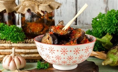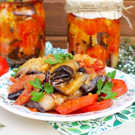 Sterilize jars and lids. Layer the sauce and eggplants, pour remaining sauce on top, seal, and sterilize jars for about 15–20 minutes. Then seal tightly. - Serve: